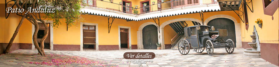 Historia / Eventos / Ubicación y contacto / Locaciones / Salón Imperial / Patio Andaluz / Patio Viejo / Jardín de los cipres / El Gran Jardín (El Mesón)